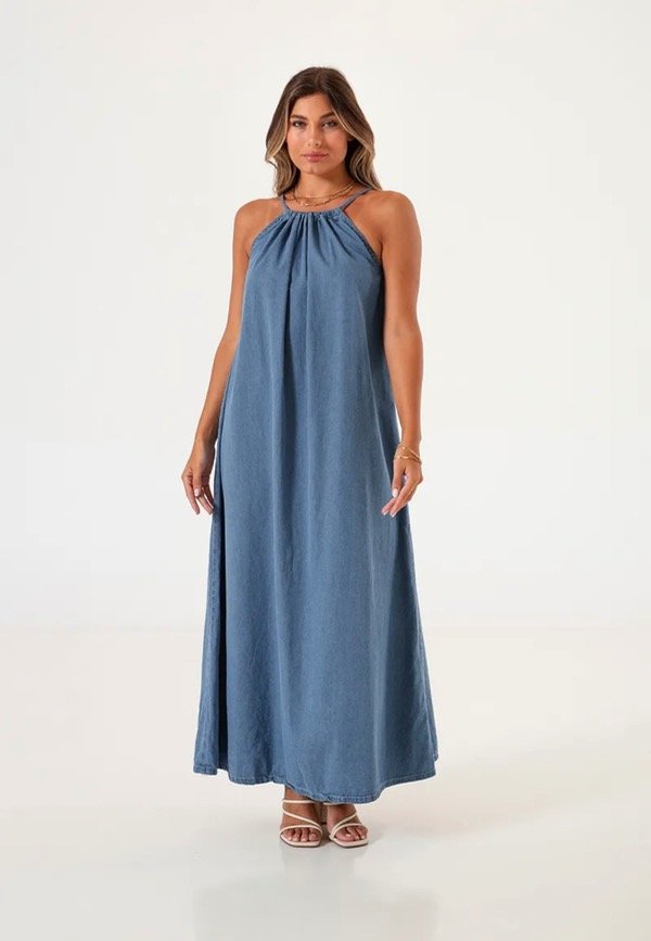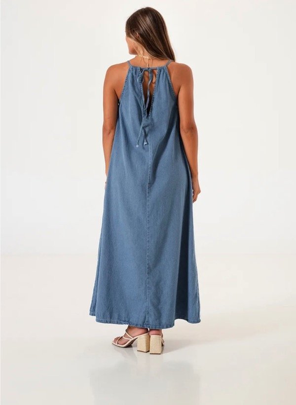 Vestido largo fluido confeccionado en tela camisera de jean. Modelo super elegante y cuenta con tiras para atar.
