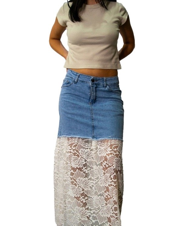 Pollera de jean customizada con encaje bordado hasta los tobillos, tajo en la parte de atras