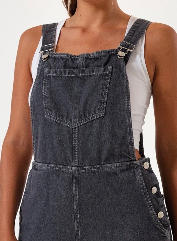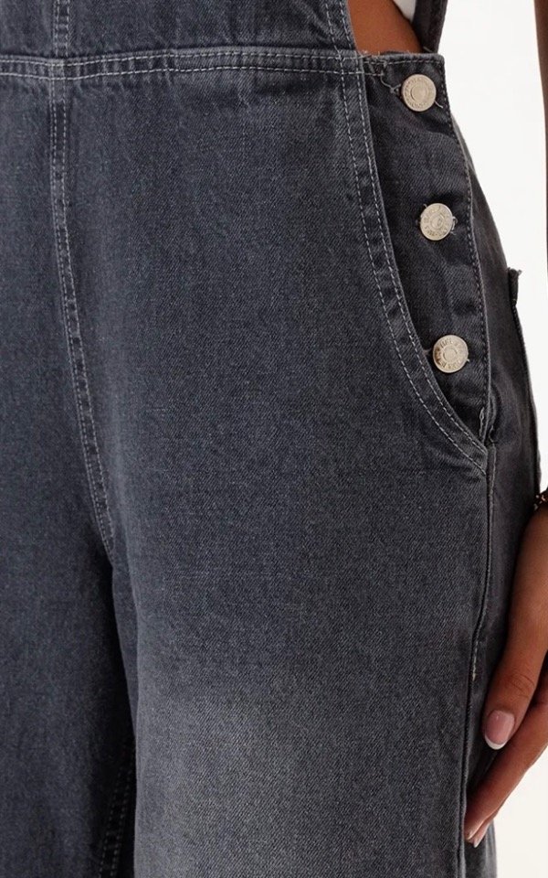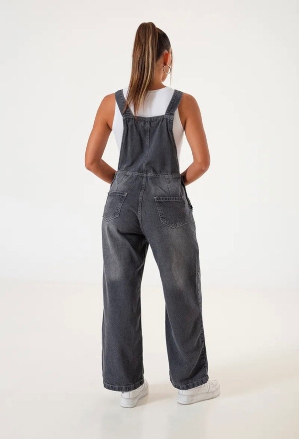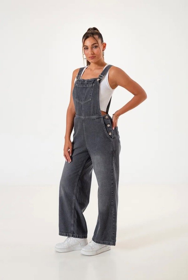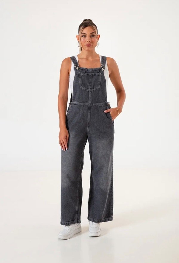Jardinero Wide Leg confeccionado en tela rígida, es más ancho, suelto y caído en las piernas.